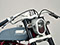 Front end: one-off CNC machined aluminium headlight with LED halo, Suzuki Goose 350 front forks, cable operated hydraulic brakes